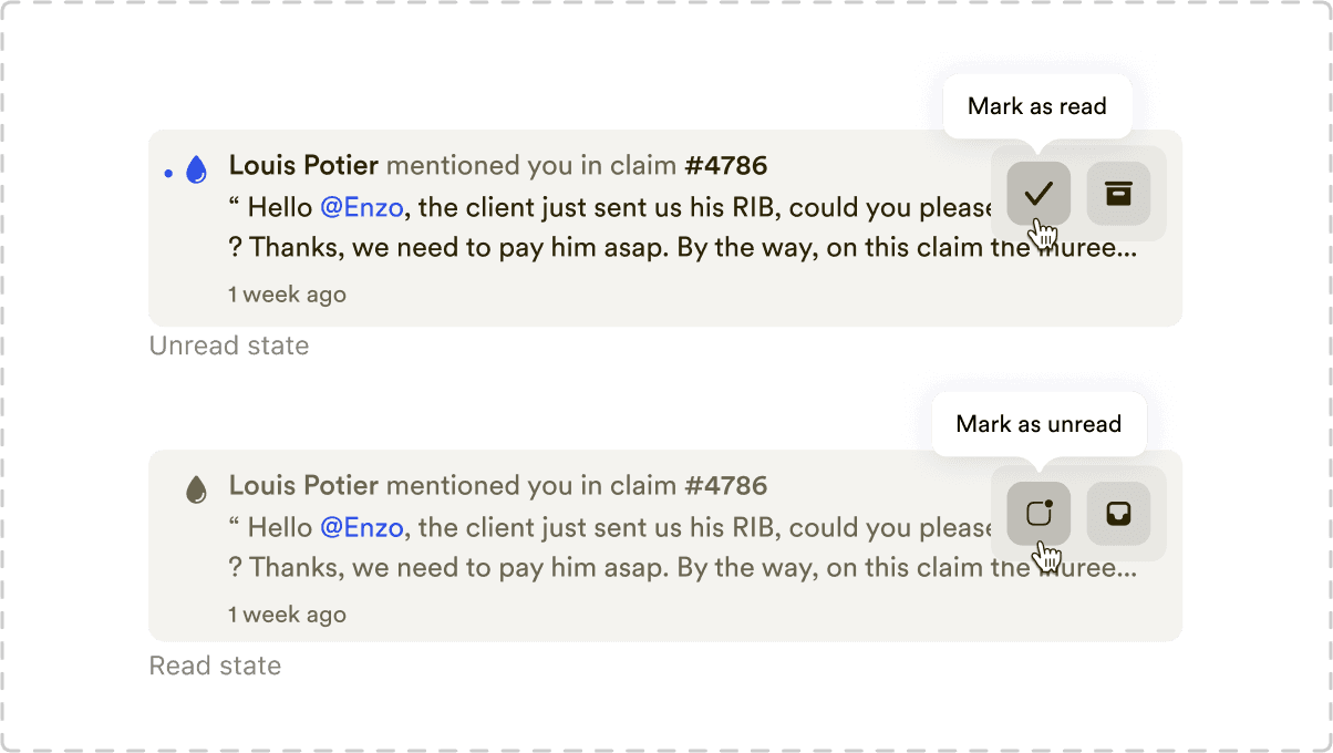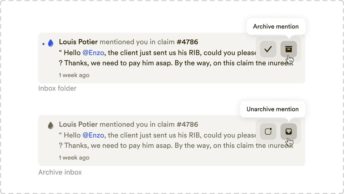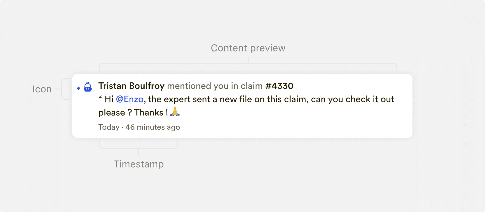 The mention component was redesigned to provide more context to users. It now includes a content preview, an icon linked to the claim type, and a precise timestamp. Helping users quickly assess whether a mention requires immediate attention.