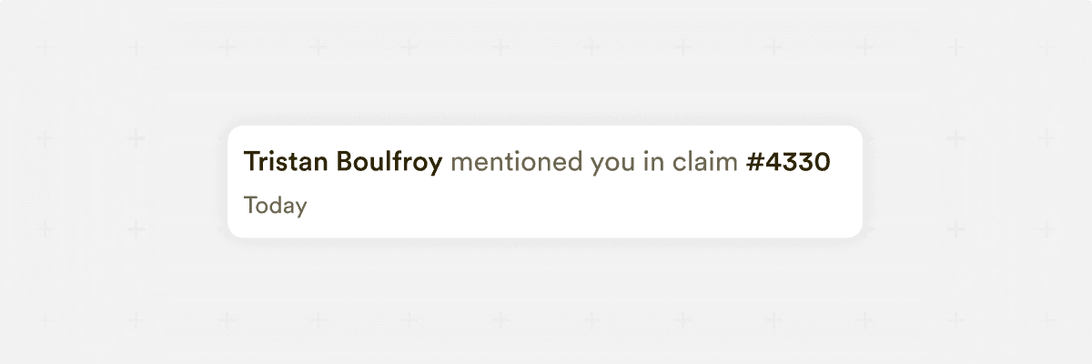 Our internal claims tool features a mentions system used daily for payment validation, fraud checks, general questions, and claim updates.
