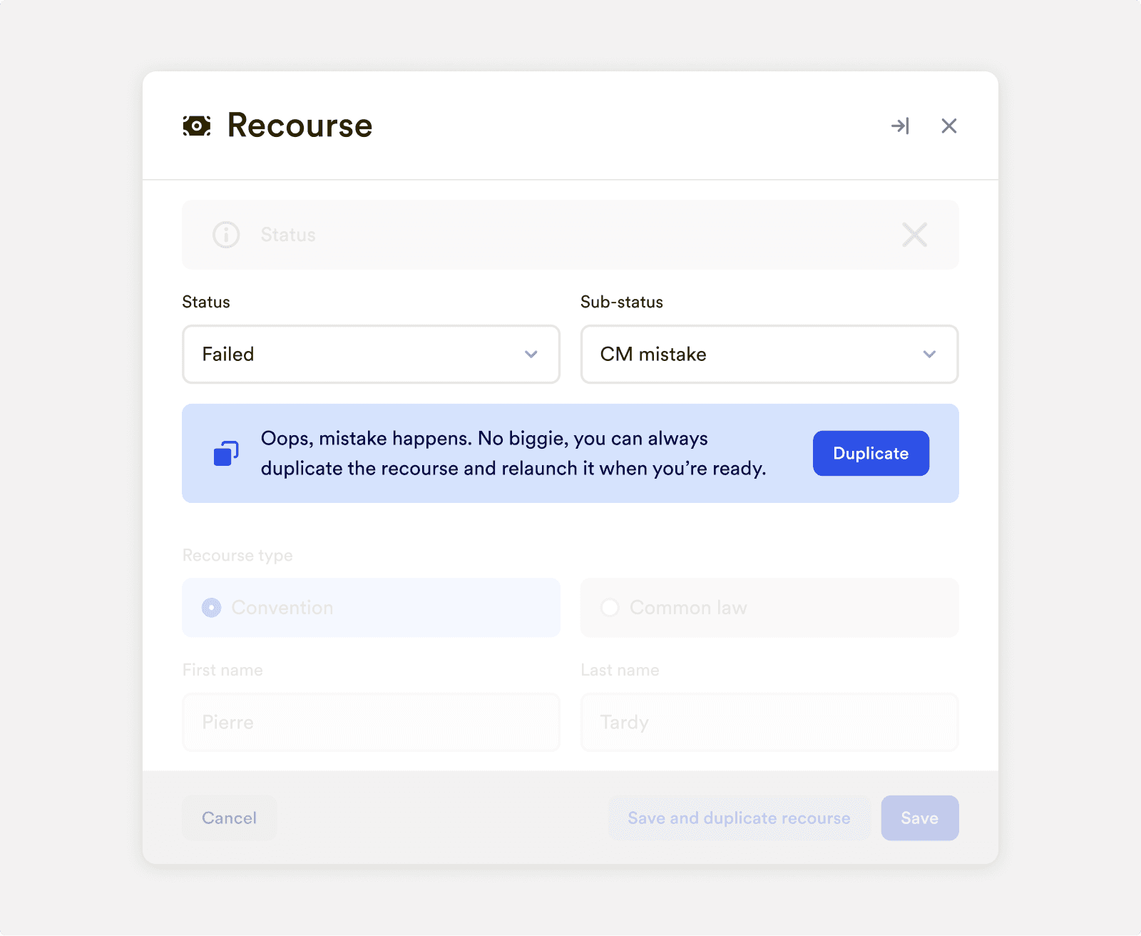 If a recourse fails due to a CM mistake, users can now duplicate it. This generates a pre-filled draft with the previous information, enabling quick updates and relaunches without the need to start from scratch.